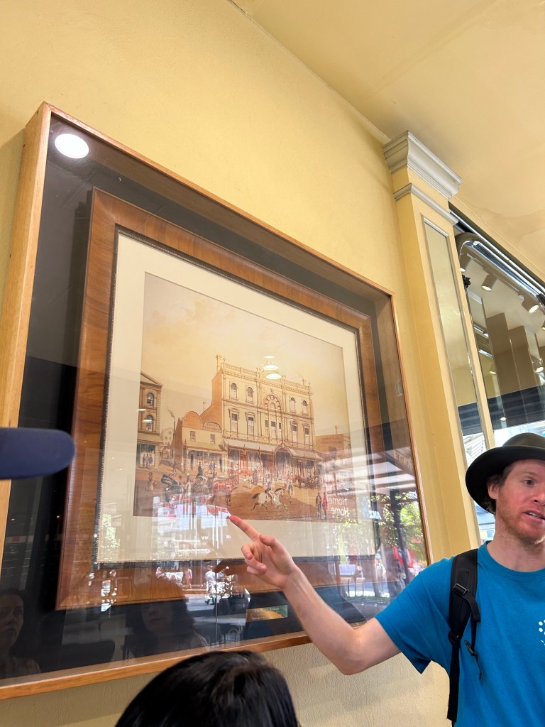 Our first stop was Collins Street, where we learned about the history of Melbourne as a colony. Australia was originally home to numerous Indigenous tribes. In 1770, James Cook sailed on the order of the British Empire and “claimed” Australia for Britain. New South Wales and Tasmania were the only established British colonies when John Batman planned to establish a new settlement. He got the First Nations chiefs in the area to sign a contract for thousands of hectares of land in exchange for tools, blankets, and other items. The contract was declared invalid by the Crown, as the lands were considered “Crown lands” at the time, and because another man, John Fawkner, also claimed settlement of the same area in a bid against Batman. Despite the conflicting claims of all parties, these thousands of hectares of land became modern-day Melbourne.