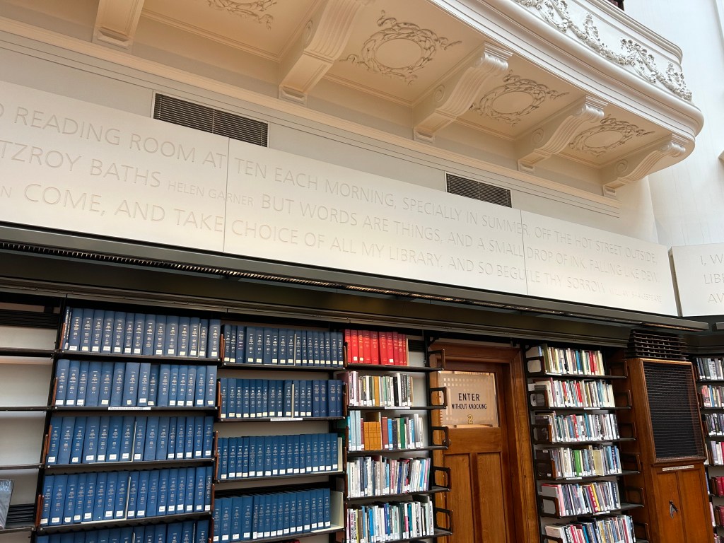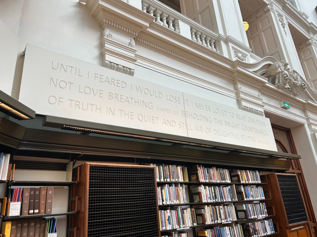 The next room I explored was the La Trobe Reading Room. It made my English major heart just soar. There are antique-style study carrels with the typical green study lights, books all around the geometrically-shaped room, a dome that lets in so much natural light, and, best of all, quotes from famous writers, readers, and thinkers all around the room. Some of my favourites are included below.