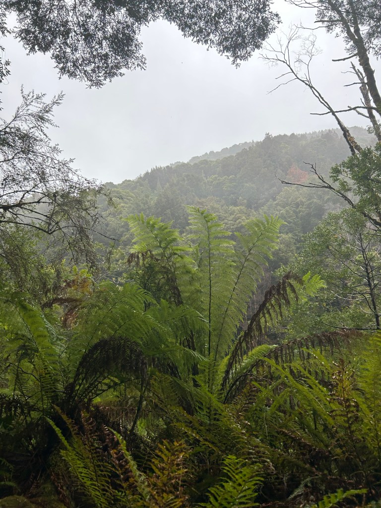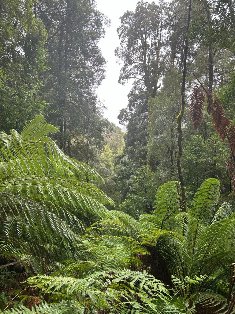 We had a bakery stop in the morning and once the group that was bound for the Gordon River Cruise was dropped off, the rest of us headed to Montezuma Falls. Between Strahan and parking at the trailhead, it started raining. We trudged through the forest up to the falls, following an old tramway that was used by a local mining company, the Montezuma Silver Mining Company, back in the 1980s. The tramway connected mining operations in the hills to smelters in Zeehan. Montezuma Falls is one of Tasmania’s 60 Great Short Walks — short, in this case, meaning 10km return. It was a beautiful walk, though, even if I couldn’t see very well for some of it because I pulled my glasses off for all the raindrops. The views of the mountains rising around us on the trail made for a special brand of seclusion.
