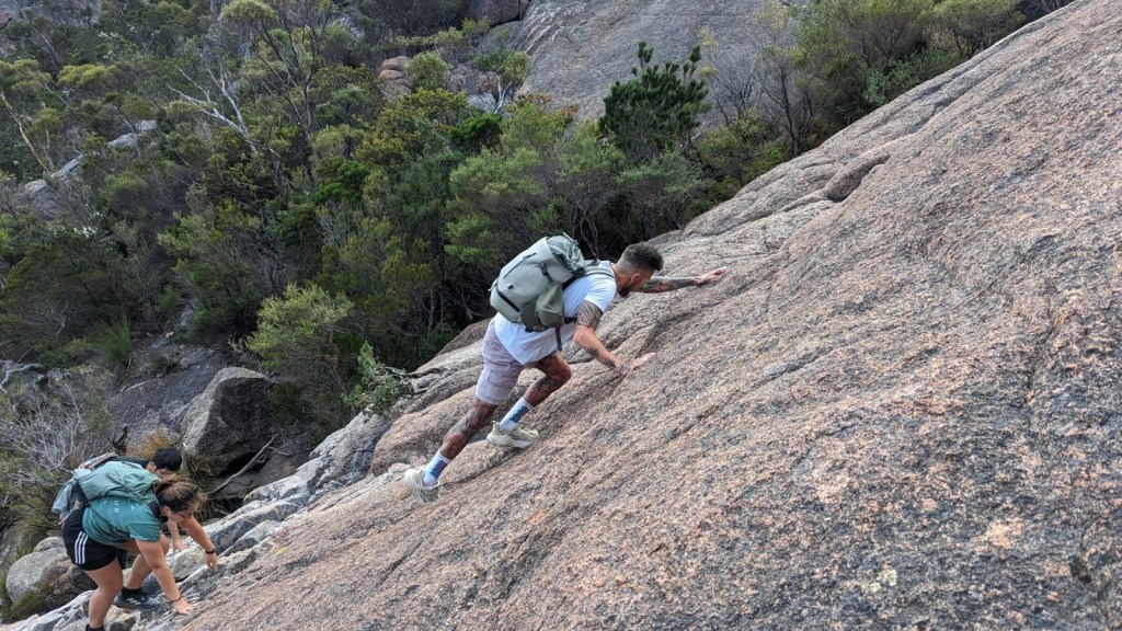 When everyone had gathered and finished their bakery stop, we got on our way to Mt Amos at Freycinet National Park. We were at the trailhead by 8:30am. Now, Mt Amos was only one of the choices afforded to us for viewing of Wineglass Bay today. There was also the option to hike the Wineglass Bay Track to the lookout, or to hike the Wineglass Bay Track to the beach, which have less elevation but which are much longer tracks including return. The previous evening, Keygan had discussed the options with some of us staying in the hostel and showed us pictures of the lookout from Mt Amos. That alone was enough to get me up the mountain, although with it being such a difficult and technical track, there were contingencies on completing it. Before we started, Keygan made sure that the rock looked dry enough to attempt and that everyone who wanted to complete the climb had grippy enough shoes to be able to walk on the rock. Because, literally, you’re climbing up a sheer rock face for a lot of the hike. Keygan had preached the climb as more difficult than our one at Cradle Mountain, with Marion’s Lookout being a warm up to this one. About six of us decided to take on Mt Amos.