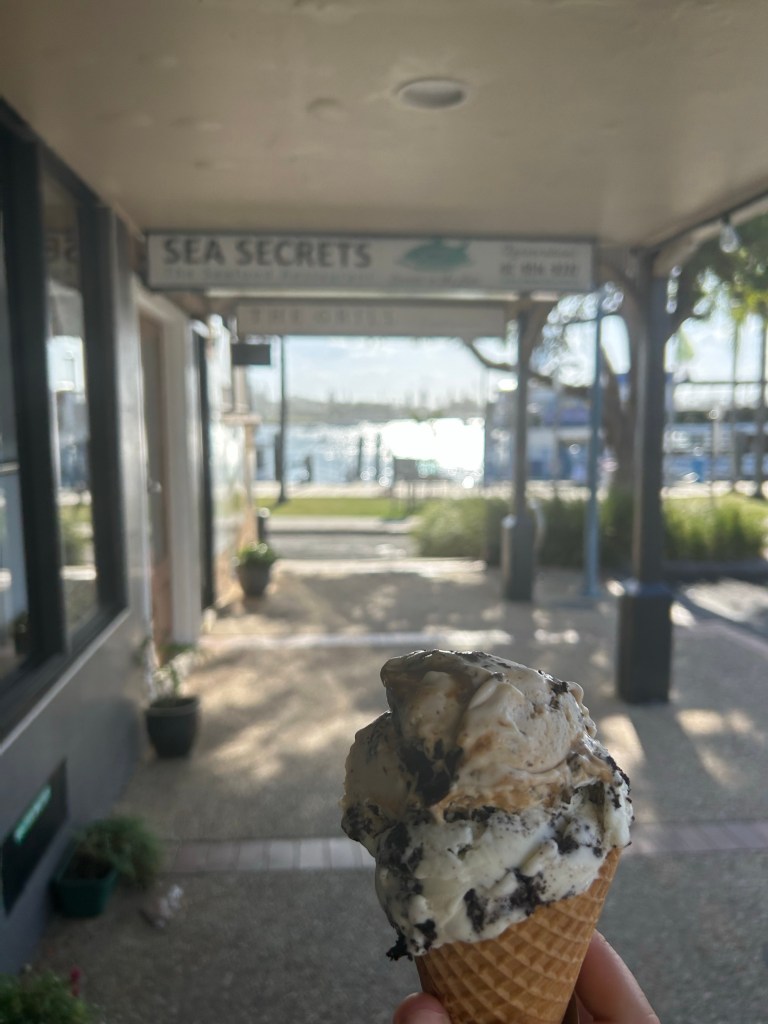 After I checked in and dropped my stuff, I decided to treat myself and went out to Blue Cow Gelato in town. I got myself a cone with Snickers and cookies and cream and sat down at the wharf to enjoy it. I headed back toward the hostel, but sidetracked and went to the IGA first as I planned to have grilled cheese and tomato soup for dinner that night. Incredibly, they had Campbells tomato soup! I picked that up and got myself a Lipton iced tea since I’d been craving iced tea for a long time. (And Nestea is nowhere in sight.)
