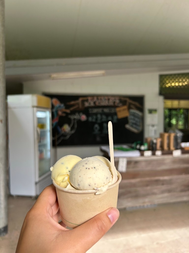 Eventually, we had to leave the beach and start winding our way back to Cairns. However, because we were all quite low on energy at this point, Cousin Kurt pulled off and made one last, unscheduled stop: at the Daintree Ice Cream Company. (Fun fact: apparently he got into trouble with the shop’s management the first time he did this because he wasn’t supposed to pull in without having a permit/schedule or something like that since it was a tour group. But now it’s all okay.) This company manufactures its own ice cream, flavoured exclusively by the fruit it grows on the property and some of which can only be found here. The special (four flavours in a cup) changes every day and, on Cousin Kurt’s recommendation, it’s what I got! The flavours of the day were coconut, passion fruit, jackfruit, and wattleseed. I’m pretty sure that my favourite flavour was the passion fruit. But it was all delicious.