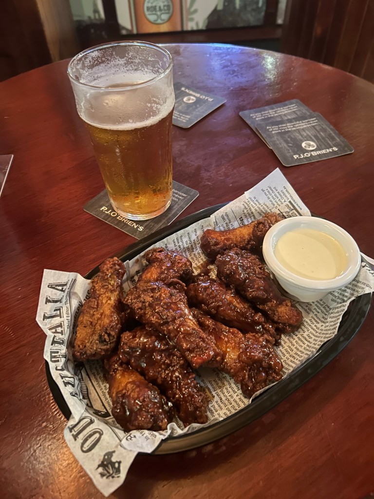 I didn’t have a place in mind but I decided to walk down by PJ O’Brien’s Irish Pub since I’d passed it so many times but had never gone in. I noticed that their special for the night was wings and a pint of Power’s, and my heart sang. I’d been craving wings for a little while and just hadn’t found any that sounded good. I went inside and ordered the wings with barbecue sauce and had my pint poured. The gentleman who took my order was Irish and, my God, the accent. I cannot wait to be surrounded by it for a solid two weeks. Power’s is brewed in Queensland and I was happy to finally try it, but I’ll tell you right now that it doesn’t have a whole lot of flavour. Refreshing as cold water on a hot summer day, just with a little bit more kick.