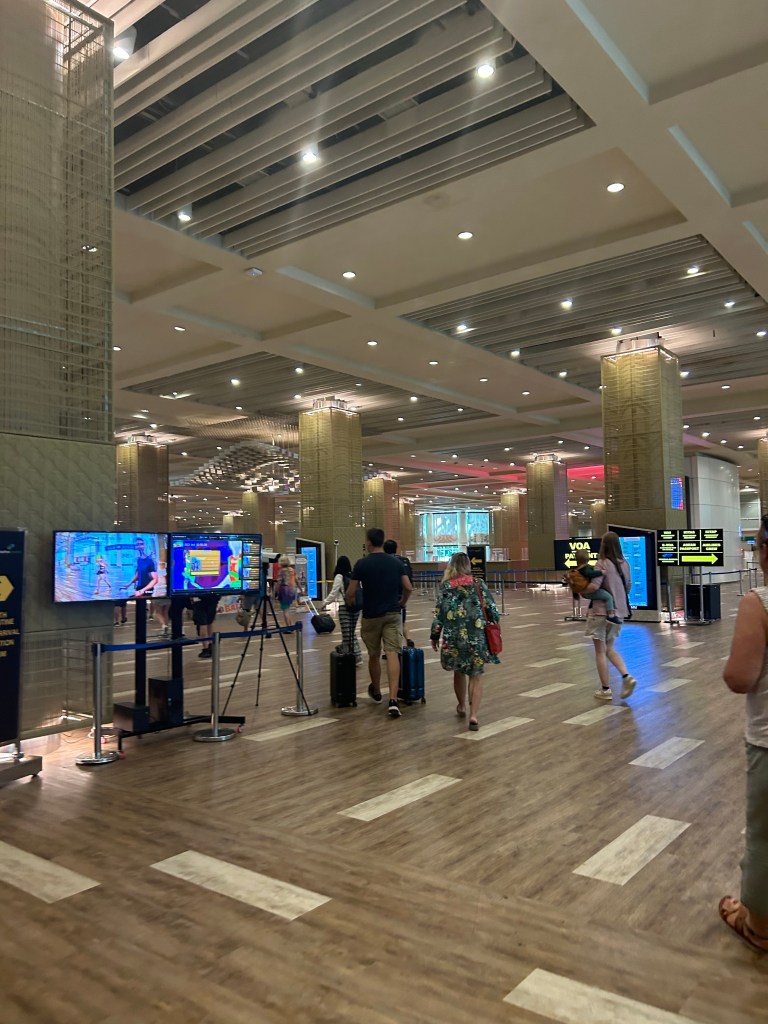 In the arrivals area, we cleared customs and immigration. That was a bit of an ordeal. I knew about the visa-on-arrival that was available for Canadian citizens (among others) but wasn’t sure whether they would need cash or card. I spent a good five minutes digging through my bag before I got up to the counter, and at least three more minutes at the counter digging through my front pocket trying to locate my envelope of Indonesian cash. Eventually I pulled everything in the pocket out, and sifted through three months of brochures and visitor booklets and other paraphernalia. I looked like a lunatic.