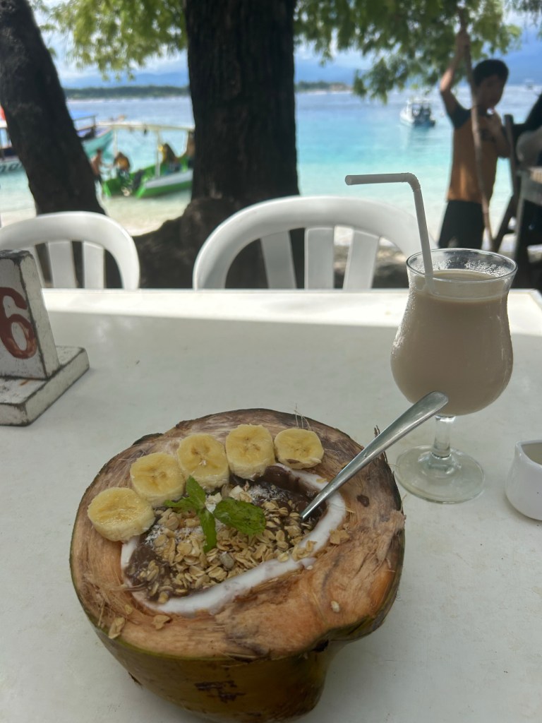 At this point, it’s still breakfast time. I still need to get some breakfast. I still would really like the coffee shop vibe and I’m determined to find a seat inside. I walk by one place and they’re only serving breakfast for another hour and they tell me this in a tone like, “You can’t order it now, it’s too late,” so I keep walking. Then I pass another coffee shop and go inside but it’s not meeting the vibe check and there’s one tiny seat inside and I can’t tell if I’m in the right place to order and I decide, “screw this,” and leave. I’m walking down the street toward the hostel again and I see a big menu advertising a chocolate smoothie bowl. It’s this place that has chairs set up on the beach and I’m like, “okay, here it is, this is what we’re doing.” I went and got a seat and a got a smoothie bowl and I got another coffee — iced this time — and I enjoyed both.