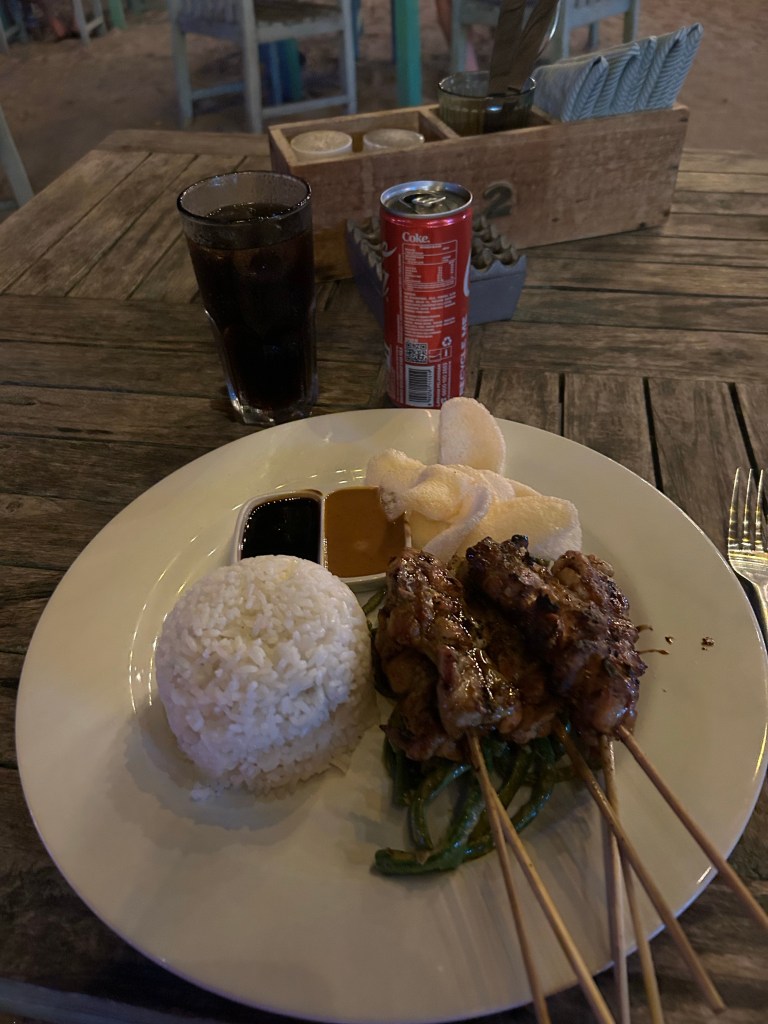 I came back to the hostel and whiled away the time until well after sunset. It was almost seven or after seven when I finally said to myself, okay, you need to have something to eat. You’re hungry and we’re not skipping dinner. I thought that I would head to the place on the beach where they advertise that they have the best pizza on the island. On my first night, it looked like a popular place and I thought it would be a nice spot to try. However, I was not in the mood for pizza and my logical brain dictates that when a place says that they have the best pizza on the island, you better try it for yourself. I didn’t want to. I ended up at a place a little closer by, still sitting outside on the beach, and I ordered a Coke and chicken satay, both of which were delicious and very satisfying.