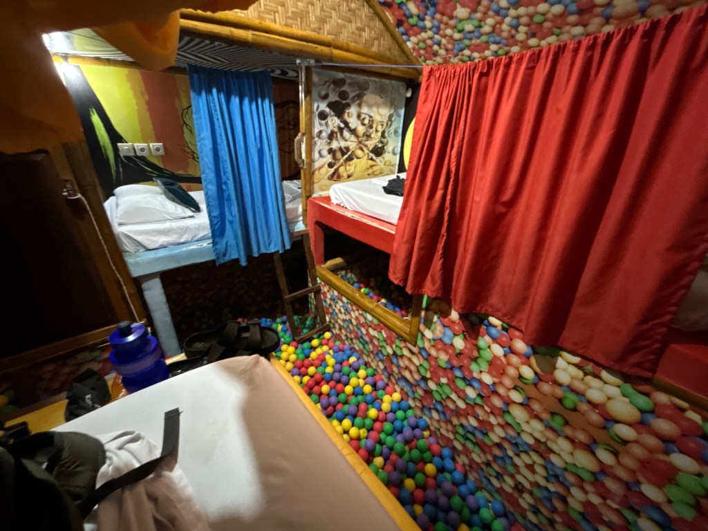 It only takes about fifteen minutes to get from island to island on the slow boat between the Gili Islands, so that put me in the hostel and checked in by 5:00pm. First impressions of the hostel were that it was so cool. If you like staying in hostels when you’re travelling, this has got to be on your list of bucket-list stays.
