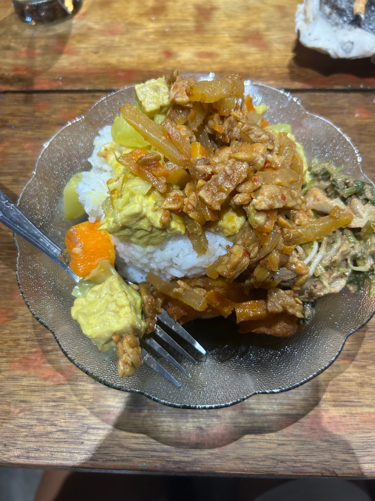 I went down for dinner at 7:30pm and sat around the table with most of the rest of the hostel, enjoying the traditional Indonesian buffet that the hostel folk put on. It was delicious, and so much food that you really didn’t need seconds. It was also more than a bit spicy! It was only 50,000IDR to join in (about $5CAD) — a major bargain!