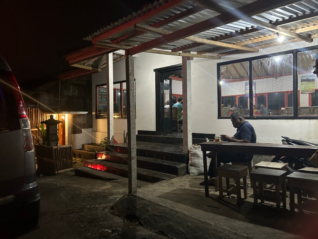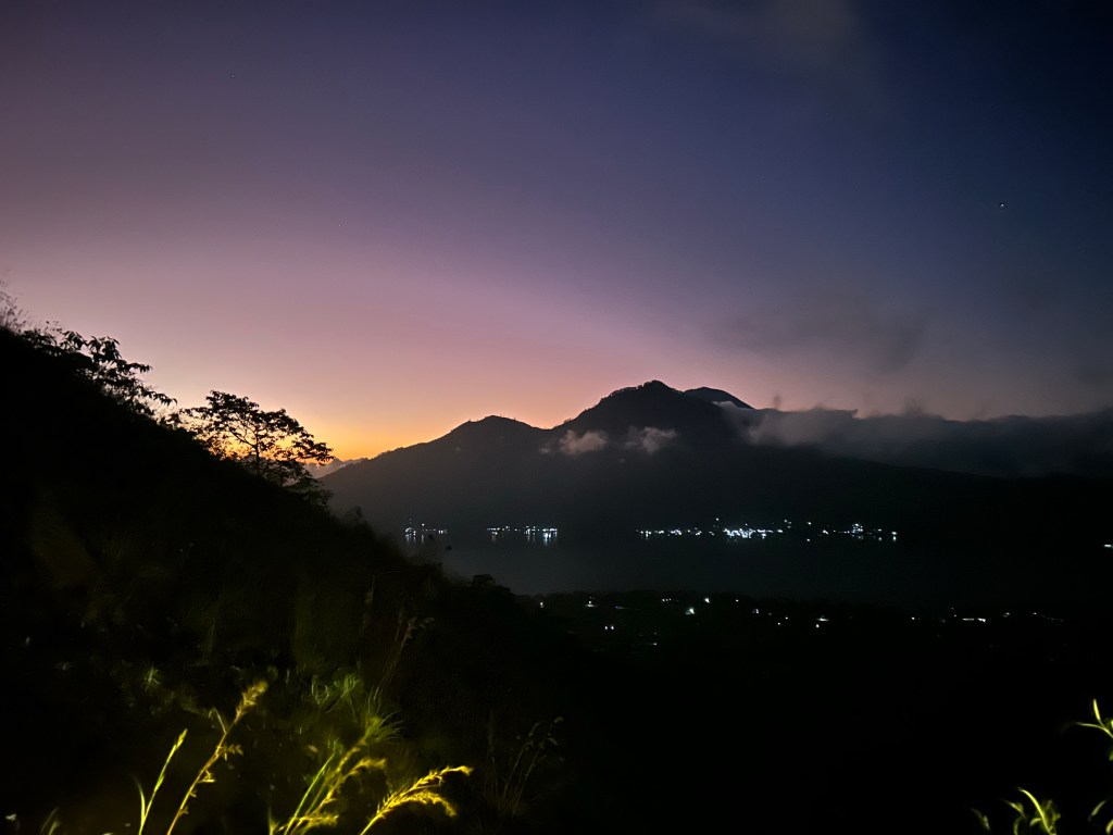 I was due to be picked up between 2:00 and 2:30am. The driver arrived closer to 2:30am and we started driving toward Kintamali, which is the village closest to the base of Mount Batur. There were six other people in the group, plus myself. We had a little breakfast of fried bananas and some coffee/tea at a little cafe in Kintamali. There were a lot of other tour groups there as well — our first taste of just how busy it would be on the trail.