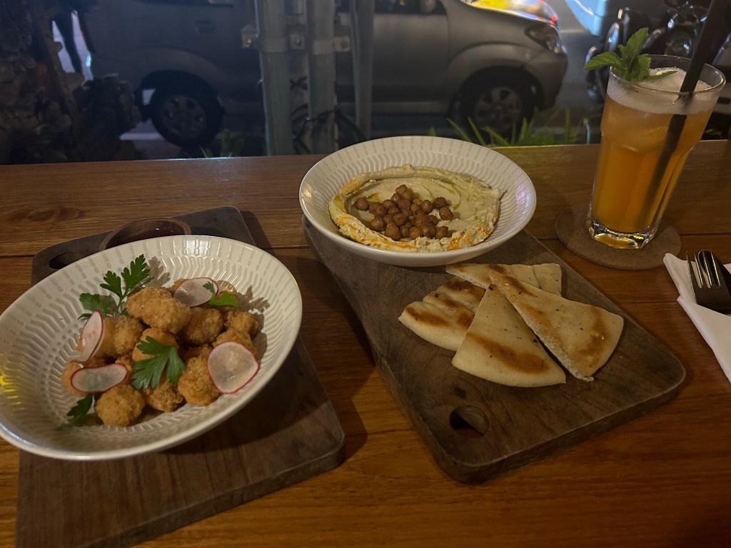 I returned to the hostel and wrote my postcards and did a little work on the blog, then relaxed a while longer. Around 7:30pm, I headed out for dinner. I went to a spot that I’d seen while walking earlier in the day and was happy to find that they had space. I ordered a peach and chamomile iced tea (delicious) and some popcorn chicken and hummus with pita bread (also delicious). Simplicity was the name of the game after the strenuous morning and I really enjoyed this dinner.