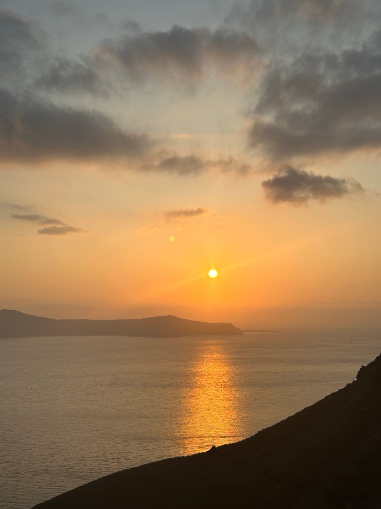 When I arrived back in Fira, I headed to Fanari, a restaurant that I’d passed several times and which seemed to have stunning views of the sunset. I knew where I wanted to sit so I asked if they had any spots left and they did, but when I headed down a level to where they’d told me, I found that none of those spots were supposed to be available. When I was going to leave, though, because I wasn’t willing to settle, they set me up with one.