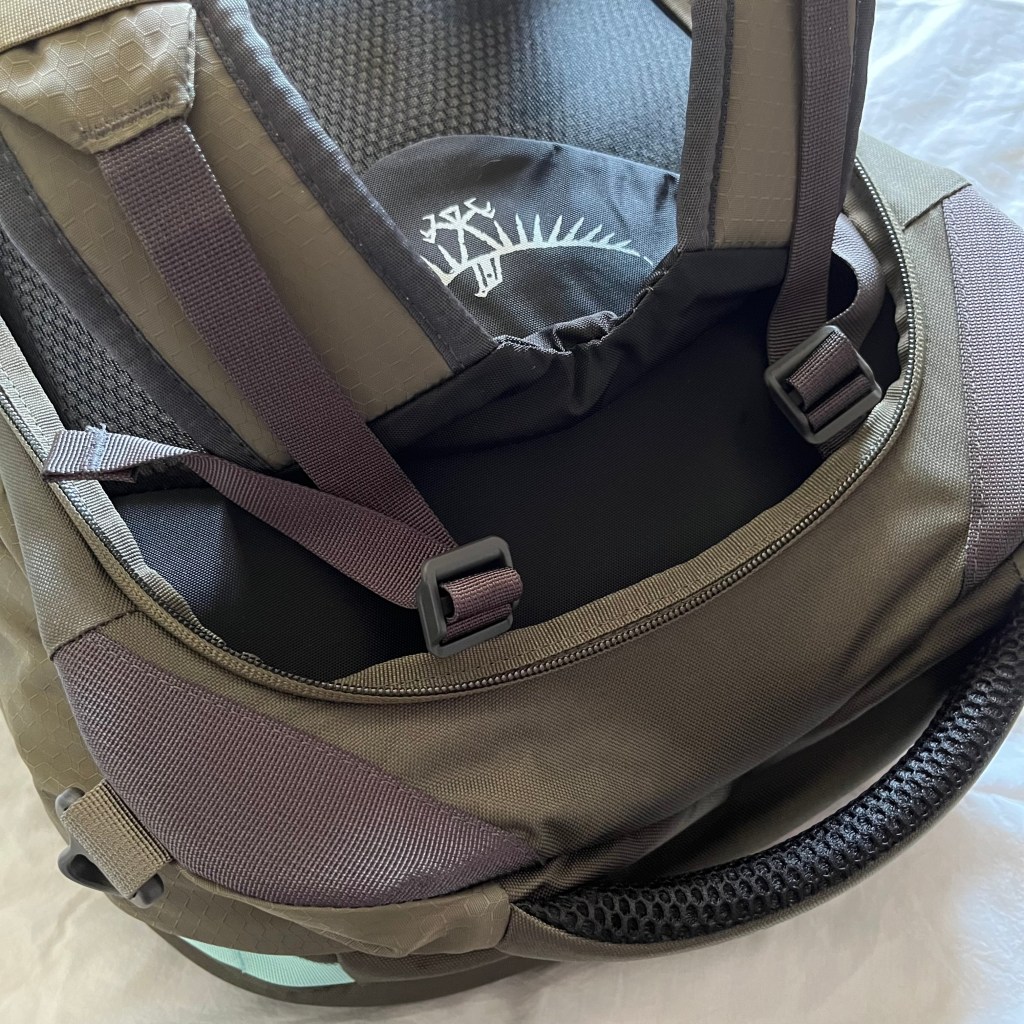 (Above) This little pocket for “quick access” at the top of the pack (with zipper hidden behind a line of fabric) has a key clip and will be excellent for small items. It’s also deceivingly deep!The straps conveniently hide away when you don’t need them with a zippered flap.Hip belt and sternum strap.